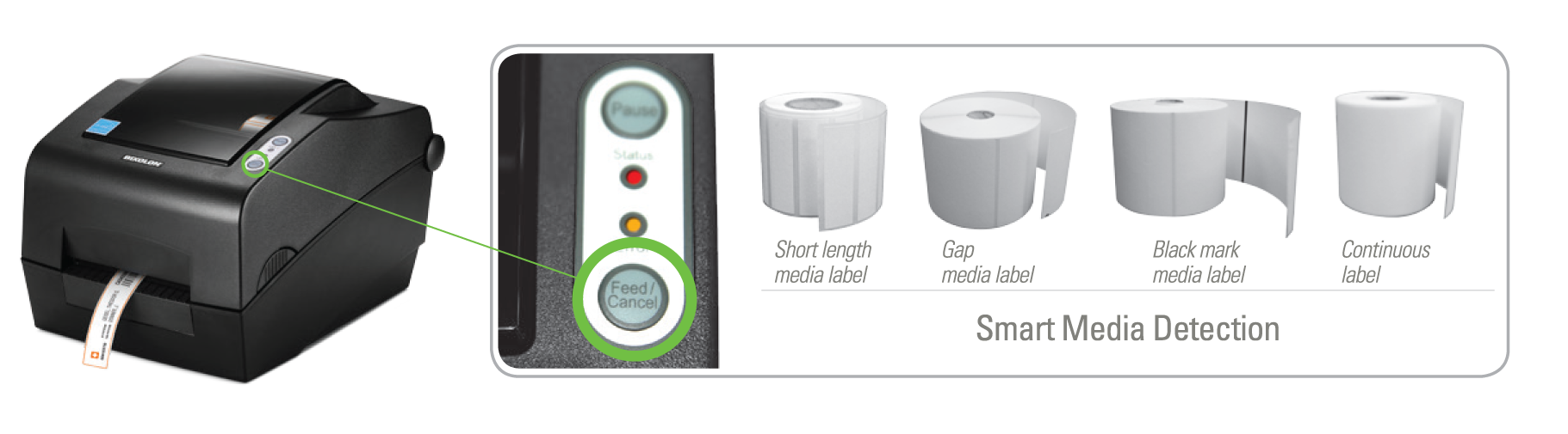 • Máy in tem nhãn SLP TX 403 có chức năng Smart Media Direction tự động nhận ra các loại giấy, mã vạch khác nhau khi tải nhãn, in nhãn như Gap Media, Black Mark Media, Short-length Media, …. Dễ dàng hoạt động bằng cách nhấn nút Feed