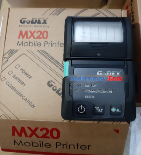 GoDEX MX20 là máy in mã vạch di động (cầm tay, mini), kết nối với máy tính không dây qua Bluetooth và Wifi, có dây qua cổng USB và RS-232, in tem mã vạch bằng công nghệ in nhiệt trực tiếp lên giấy decal cảm nhiệt.
