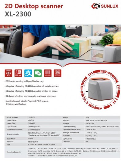 THÔNG SỐ KỸ THUẬT CỦA ĐẦU ĐỌC MÃ VẠCH 2D ĐỂ BÀN SUNLUX XL-2300